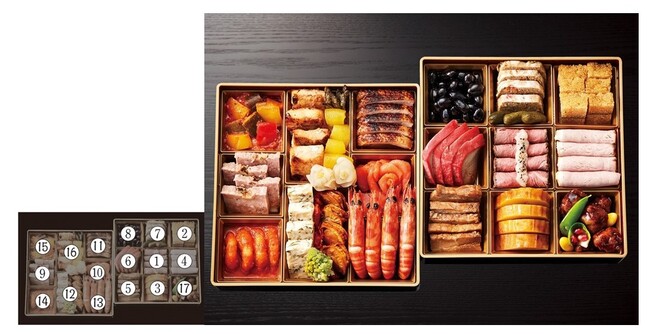 おせちの蓋には、相模鉄道と東急電鉄が「新横浜駅でつながる」をコンセプトに相模鉄道キャラクター「そうにゃん」と東急線キャラクター「のるるん」が喜びながら手をつなぎ、「つながる」ことを楽しみにしている様子を表現した開業PRロゴをあしらいました。地域間の活性化につながるよう、各路線沿線にある日本料理・フランス料理・中華料理・イタリアンの味を集めた二段重おせちです。