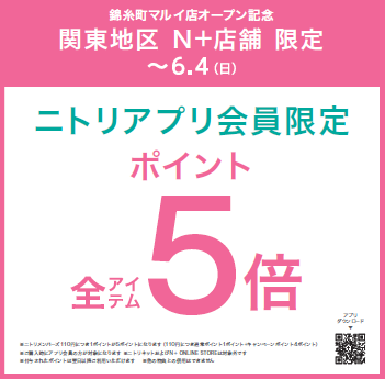 N+ 錦糸町マルイ店を含めた関東地区(東京都・神奈川県・千葉県・埼玉県・静岡県)の全18店舗限定で、オープン協賛キャンペーンを実施いたします。N+おすすめの14アイテムをスペシャルプライスでご用意する他、ニトリアプリ会員様限定特典として、全アイテムポイント5倍でお買い求めいただけます。