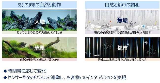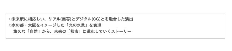 具体的には、新しい街につながる未来駅に相応しい、リアル(実写)とデジタル(CG)とを融合した演出で、「水の都・大阪」をイメージした「光の水景」を表現します。