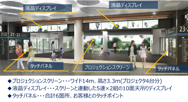 地下駅コンコース階の空間を最大限に活用し、迫力ある演出で没入感をお楽しみいただける「インタラクティブ空間」にぜひご期待ください。