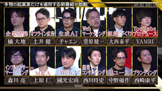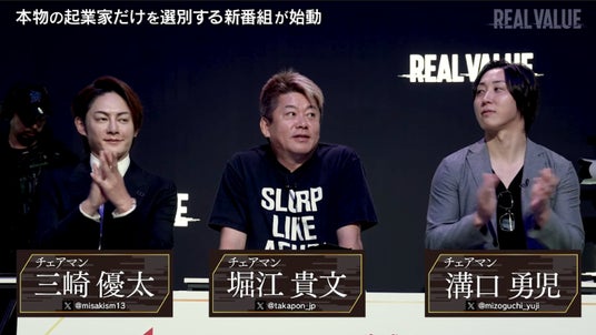 『REAL VALUE』とは、ビジネスの第一線で活躍し続ける堀江貴文、溝口勇児、三崎優太が認める各領域のトップ経営者だけを厳選して始動した経営エンターテイメント番組。