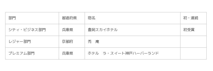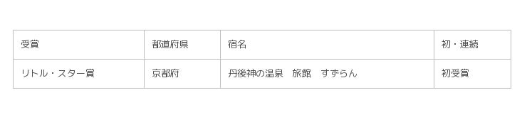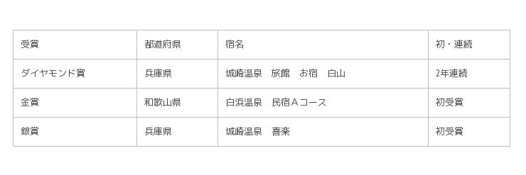 当該地区及び宿のカテゴリー別に、お客さまの声の「総合」部門において、最も高い評価を得た宿に贈られます。