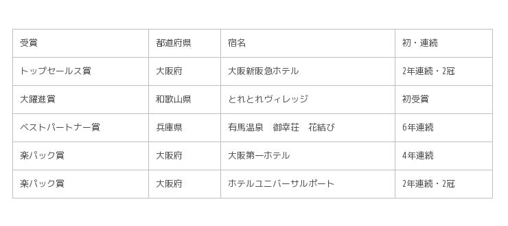 「楽天トラベルアワード2015」は、取扱額やお客さまの評価などを総合的に評価し決定する「総合部門」と、各項目で飛躍的な実績をあげた宿を表彰する「個別部門」の2部門にて発表いたします。近畿地区では、以下の37宿が受賞し、そのうち13宿が初受賞となりました。発表内容は以下の通りです。