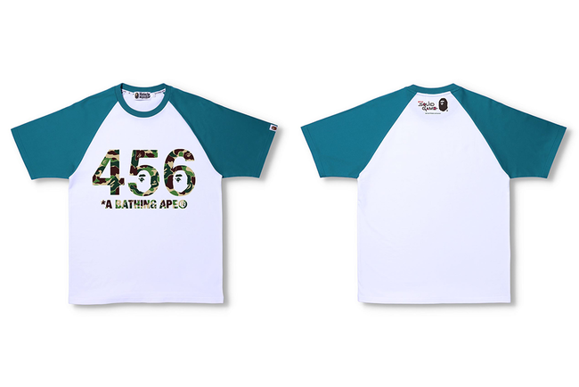 ブランドの象徴であるAPE HEADにタイトルのハングル文字が施されたデザインには、主人公の番号である「456」が落とし込まれている。また、劇中でゲーム参加者が着用するジャージにインスパイアされたTEEのフロントには ABC CAMO で「456」が配され、インパクトのあるデザインとなっている。ジャージを着用したBABY MILO(R)とマスクをつけたゲームの運営スタッフが並ぶシーンを描いたグラフィックのTEEも登場するなど、「BAPE(R)︎」と「イカゲーム」、双方の世界感を存分に味わえるコレクションに仕上がっている。