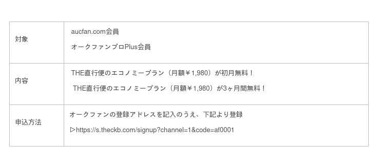 株式会社オークファン(本社:東京都品川区、代表取締役:武永修一、以下「オークファン」)では4月10日より、当社が運営する国内最大級の相場検索サイト「aucfan.com」の会員様に向け、リサーチ・交渉・買い付け・検品・納品まで全て請け負う中国輸入代行サービス「THE直行便」のエコノミープラン(月額¥1,980)を初月無料にてご利用いただける入会特典をプレゼント中です。