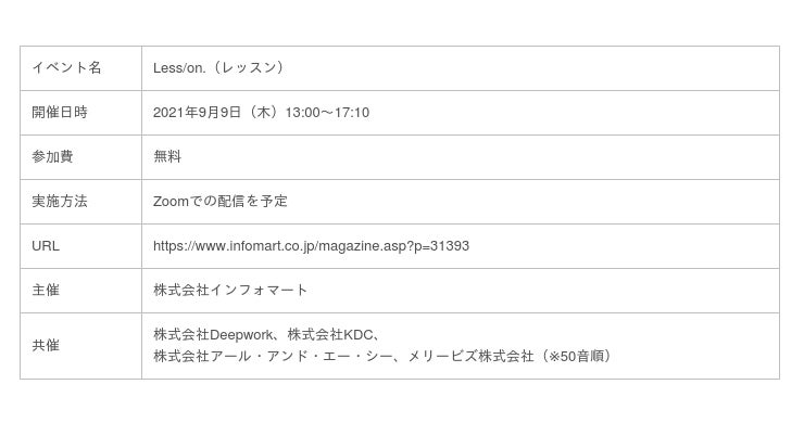 BtoBビジネスを革新する信頼のリーディングカンパニーを目指す、株式会社インフォマート(本社:東京都港区 代表取締役社長:長尾 收、以下「当社」)は、企業のDX・デジタルシフトを推進する「学びの場」として、1DAYオンラインイベント「Less/on.(レッスン)」を2021年9月9日(木)に開催いたします。