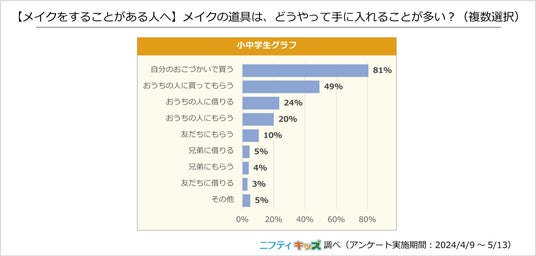 「自分のおこづかいで買う」人が81%と、全体の大半を占めています。それ以外では「おうちの人に買ってもらう」「おうちの人に借りる」など、家族の協力を得てメイクの道具を手に入れる人も多いようです。