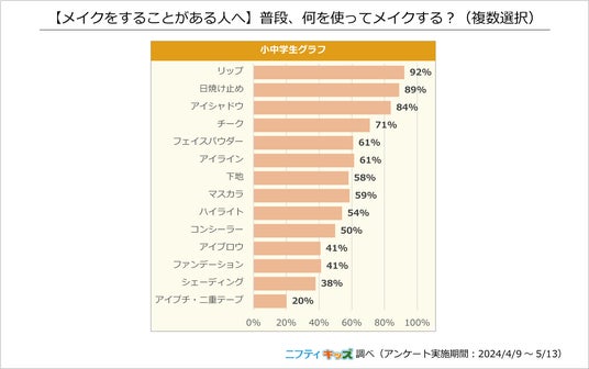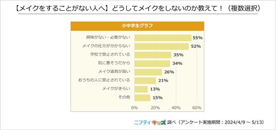 一方でメイクをしない人の半数が「興味がない・必要がない」「メイクの仕方が分からない」と回答しており、メイクに対して関心や知識がない小中学生も少なくないようです。
