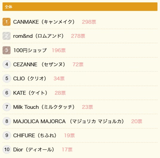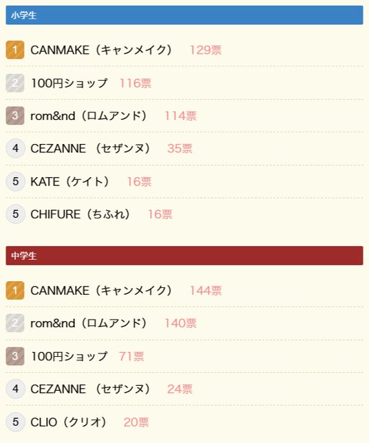 小学生、中学生どちらのランキングでも1位に輝いたのは、「CANMAKE」でした。世代ごとで順位に変動はありますが、「rom&nd」「100円ショップ」「CEZANNE」と比較的手ごろな価格で手に入るブランドが並びます。