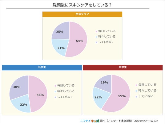 「毎日している」「時々している」と回答した人を合わせると、小学生が70%、中学生が81%であることから、小学生から中学生に上がりスキンケアを意識する人が増えていることがわかりました。
