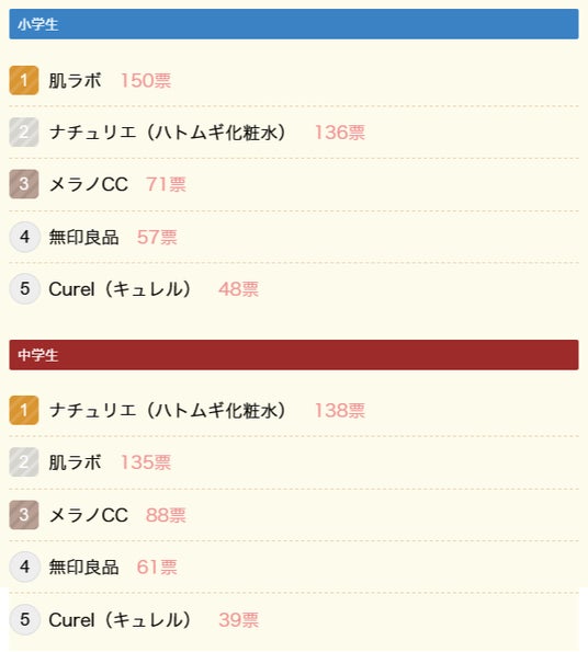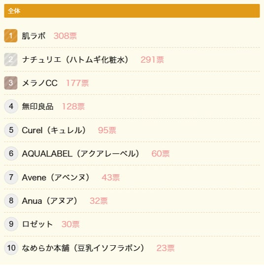 「肌ラボ」、「ナチュリエ(ハトムギ化粧水)」が多くの支持を集めました。3位以降も「メラノCC」「無印良品」「Curel」と続き、1000円から2000円程度で手に入るプチプラの化粧水が人気を集める結果となりました。