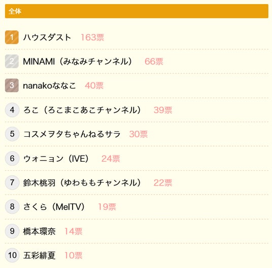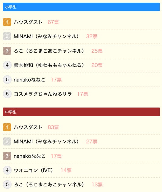 すべてのランキングで1位に輝いたのはYouTuber、TikTokerとして活動する「ハウスダスト」でした。全体ランキングで上位にランクインした有名人の多くがYouTuberとなっていて、小中学生の間でYouTubeなどのSNSが欠かせない情報源となっていることがわかりました。
