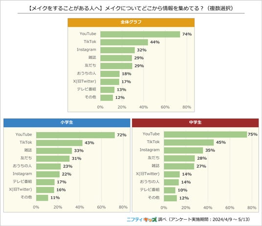 また、使っているメイク用品で最も多いのは「リップ」の92%で、ブランドでは韓国コスメの「rom&nd」が最も人気を集めています。メイク情報の入手手段では小中学生ともに「YouTube」が最も多く、いずれも7割を超える結果となりました。