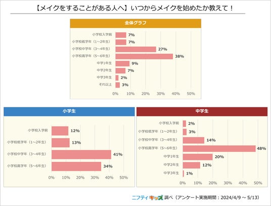 中学生は「小学校高学年(5~6年生)」が最も多かったのに対し、小学生は「小学校中学年(3~4年生)」が最も多い回答となりました。このことから、小中学生がメイクを始める時期はここ数年で早くなっていると予想されます。