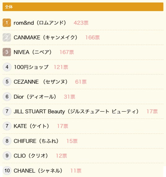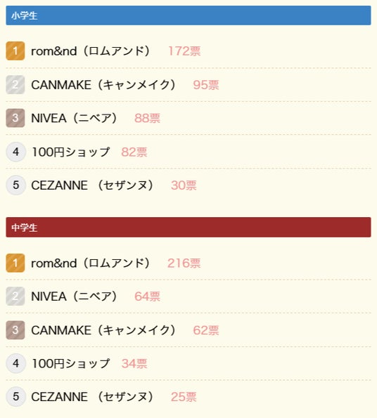 小学生と中学生のランキングは同様の結果となりました。1位の「rom&nd」は韓国のコスメブランドで、手ごろな価格ながら豊富なカラーバリエーションで人気を集めているようです。