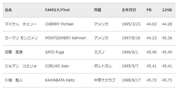 日本からは、オレゴン2022世界選手権4x400mリレーにおいてアジア記録/日本記録(2分59秒51)で4位入賞を果たした佐藤風雅(ミズノ)、川端魁人(中京大クラブ)が出場予定です。