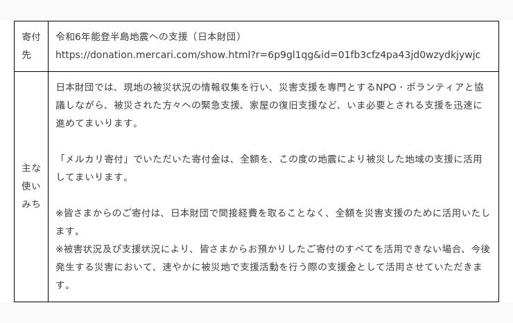 ※2:メルカリ、能登半島地震による被災地の支援を「メルカリ寄付」機能で受付開始(2024年1月)https://about.mercari.com/press/news/articles/20240102_donation/