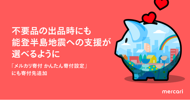 株式会社メルカリ(以下、メルカリ)は、2024年1月15日より「メルカリ寄付 かんたん寄付設定」機能(※2)における寄付先に、能登半島地震による被災地の支援を追加いたします。これにより、「メルカリ」への出品時、寄付先に「日本財団(災害復興支援特別基金)」を選択し、取引完了時に販売利益から事前に指定した割合の金額を寄付することができます。