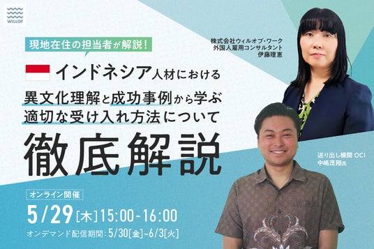 ウィルグループの総合人材サービスを手掛ける株式会社ウィルオブ・ワーク(本社:東京都新宿区、代表取締役社長:村上 秀夫)は、無料オンラインセミナー『現地在住の担当者が解説!インドネシア人材における異文化理解と成功事例から学ぶ適切な受け入れ方法について』を、2025年5月29日(木)に開催します。