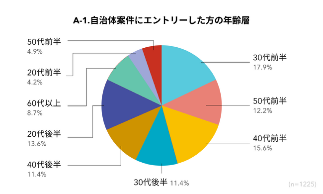 これまで当社では300名以上の複業人材と自治体をマッチングしてきました。当社がエントリー時に取ったアンケート※によると、自治体案件に応募する年齢層は幅広く、30代前半をボリュームゾーンとしてその他の年代にも広がっていることが分かりました。中には10代からのエントリーもありました。