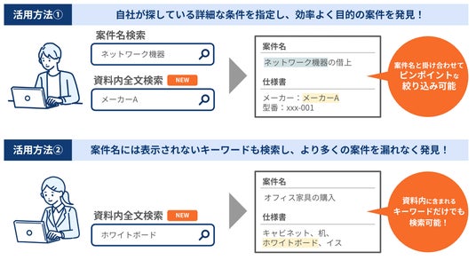 また、従来の案件名検索では見逃していた案件も、資料内テキストの検索によって漏れなく収集できるようになり、網羅性が大きく向上します。