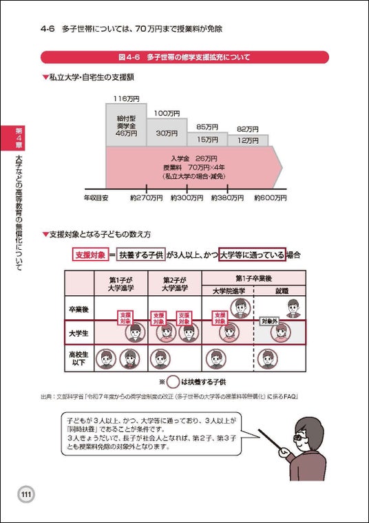 また、2025年度から始まった、多子世帯向けの授業料減免など、近年拡充が進む高等教育の無償化についても、最新の情報を紹介しています。