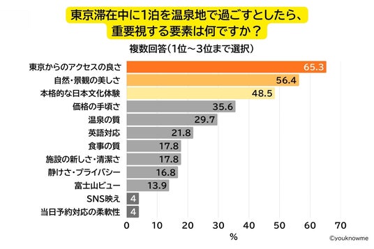 温泉地に宿泊するにあたり、重要視する要素を聞いたところ、「東京からのアクセス(65.3%)」や「美しい自然・景色(56.4%)」、「本格的な日本文化体験(48.5%)」が多く、その他にも価格の手頃さや英語対応という回答が続きました。