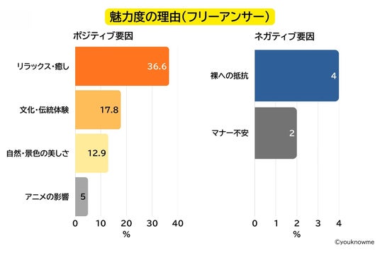 なぜ魅力的に感じるのか(フリーアンサー)という設問に対する回答で多かったキーワードとしては、「リラックス・癒し(36.6%)」「日本文化体験がしたいから(17.8%)」でした。魅力を感じないと回答した人は、文化の違い等による「裸への抵抗感」や「マナー不安」といった要素を理由として挙げていました。