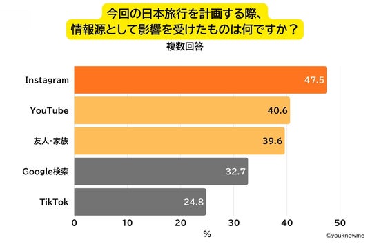 また、日本旅行の情報源については、Instagram(47.5%)、YouTube(40.6%)、その他友人の口コミやGoogle検索と続きました。