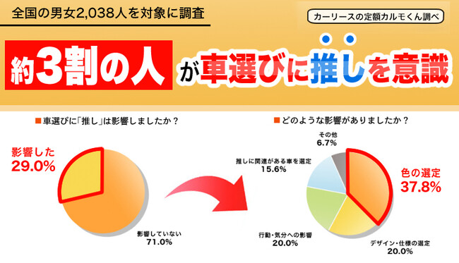 個人向けカーリースサービス「おトクにマイカー 定額カルモくん」(以下、定額カルモくん)を提供するナイル株式会社(本社:東京都品川区、代表取締役社長:高橋 飛翔)は、全国の男女2,038人を対象に、「推し」の有無や車選びへの影響についてインターネット調査を実施しましたので、調査結果をお知らせいたします。