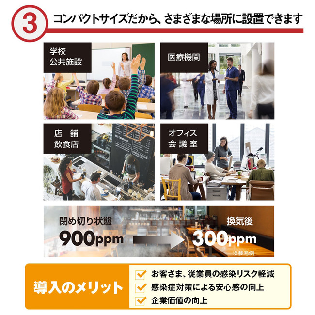 集団感染リスクの要因の1つである「換気の悪い密の密閉空間」を改善するための換気対策にこれから注目されている商品です。