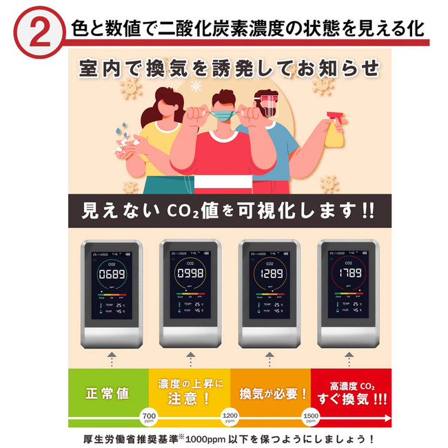 飲食店、商業施設、学校、イベント会場、オフィス、会議室など密になりやすい場所で換気をする目安にご使用下さい。