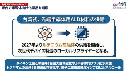台湾塑膠工業(台塑)をはじめとする台プラグループは、TSMCの増産計画に合わせて半導体向け化学品などの材料を増産します。汎用品事業を縮小し、高付加価値製品への転換を図る5カ年計画を始動。米国テキサス州での電子工業用塩酸製造工場(2028年末稼働予定)の増設や、台湾国内でのダイキン工業、トクヤマとの合弁による高純度フッ化水素酸(HF)、高純度IPAなどの生産能力拡大を進めます。