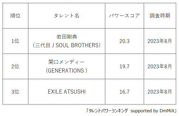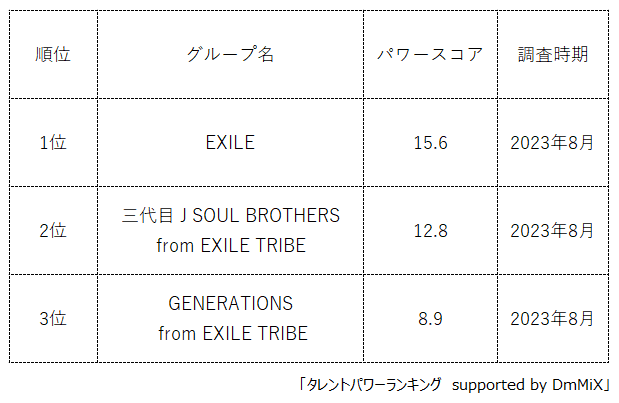 『タレントパワーランキング』では、タレントパワーランキングに登録されているEXILE TRIBEのグループ・メンバーのパワースコアを調査。