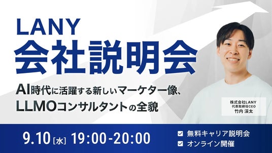 デジタルマーケティング支援を行う株式会社LANY(東京都渋谷区、代表取締役社長:竹内渓太)は、オンライン会社説明会を9/10(水)に開催いたします。