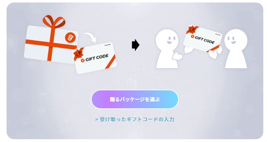 贈る側のユーザーが所持しているデジタルグッズをギフトコードに変換、贈られた側のユーザーがギフトコードを引き換えることで、デジタルグッズを使用できるようになります。