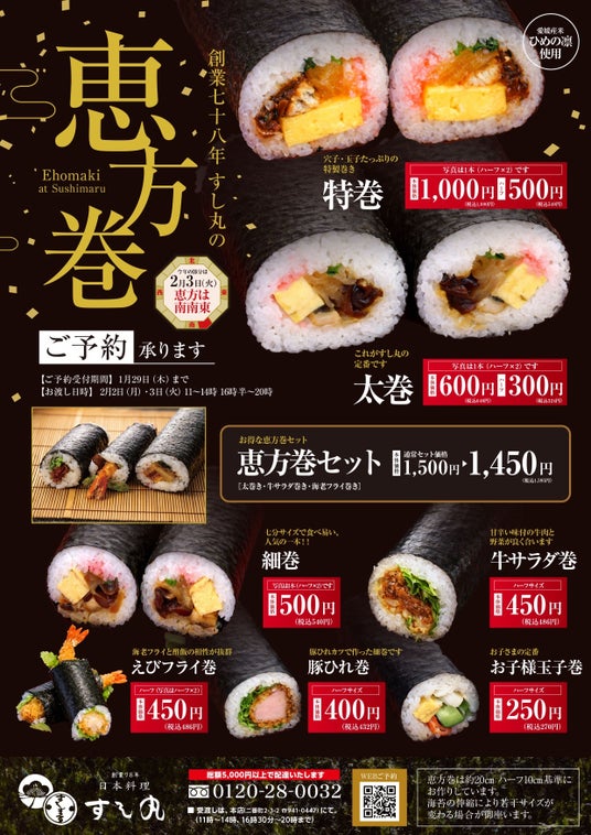 愛媛県松山市で長く親しまれている老舗寿司店「すし丸」(本店:愛媛県松山市二番町)は、2026年2月3日(火)の節分に向けた特製「恵方巻」の予約受付を正式に開始いたしました。