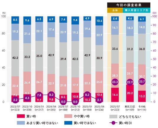 しかしながら、「今が買い時だと思う」と回答した人の割合は44.9%に達し、前回調査よりも大きく増加しました。これは、「価格が高い」と感じながらも、将来的なさらなる値上がりや金利上昇リスクを見越し、「価格が下がる見通しが立たないなら、早めに購入すべき」と考える層が増えていることがうかがえます。そのため、“今が最も有利な条件で購入できるタイミング”と捉える層が増えている状況が明らかとなりました。また、買い時DI※も23.3%となり、2015年以来の20%台に回復しています。