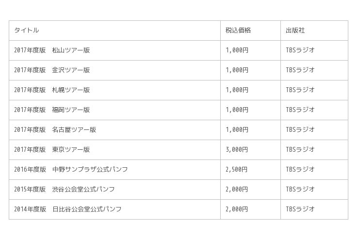 今回のラインナップは、既に完売し手に入れることの難しい2014年版のパンフから、2017年までのパンフレット全9種類と、4月14日(土)に開催されるイベント会場のみで販売される『許可局十年史』です。また、9種のパンフレット全てを網羅した合本版も発売。合本版には、2011年8月の日比谷公会堂で販売した許可局最初の「公式パンフレット」が特典として付いてきます。