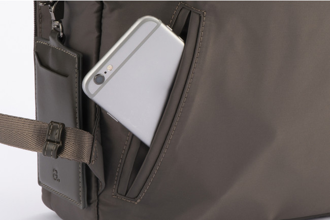 背面に洋服のポケット感覚で使えるスマートフォン用ポケット「スマートアクセスポケット™』付き。中身が滑り落ちにくい構造になっており、あえてファスナーを付けないことでアクセスしやすくしています。