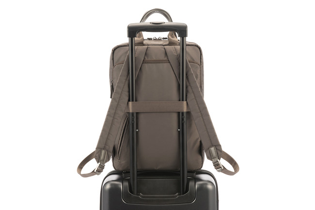 クッション材入りで衝撃を和らげる「PC 収納部」や、スーツケースのハンドルに差し込んで固定できる「セットアップベルト」付き。リモートワークや出張にも活躍します。