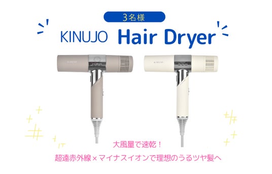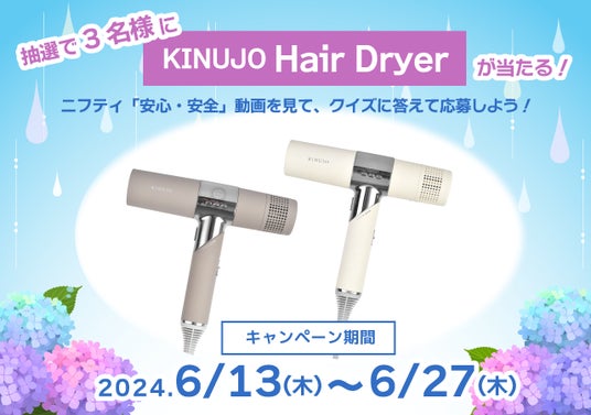 本キャンペーンは、当社の「安心・安全」に対する取り組みを発信する施策の一つとして実施するものです。期間中に当社の公式SNS(X・Instagram)をフォローの上、安心・安全なサービス提供に向けた当社社員のメッセージ動画を視聴し、動画の最後にあるクイズに応募フォームから解答いただくことでキャンペーンに参加できます。応募者の中から抽選で3名様に「KINUJO Hair Dryer」をプレゼントします。