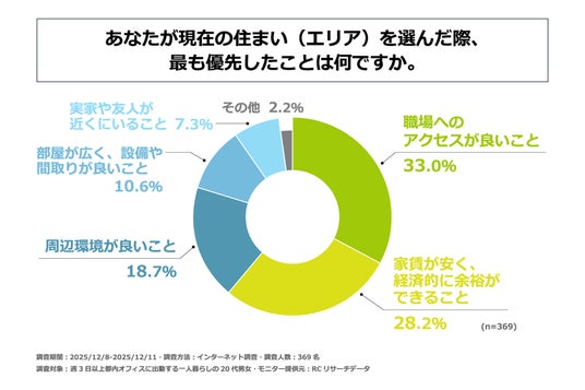 都内で働く一人暮らしの20代の住まい選びにおいて、依然として大きな判断軸となっているのが「通勤時間」です。実際に、現在の住まい(エリア)を選ぶ際に最も優先したこととして、「職場へのアクセスが良いこと」を挙げた人は33.0%と最多となり、「家賃が安く、経済的に余裕ができること」(28.2%)、「周辺環境が良いこと」(18.7%)を上回りました。