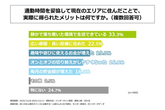 しかし、通勤時間が長くなったことで得られたものもあります。通勤時間を妥協して現在のエリアに住んだことで感じているメリットとしては、「静かで落ち着いた環境で生活できている」(33.3%)が最多となり、「広い部屋・良い設備に住めた」(22.5%)が続きました。一方で、「特にない」と感じている人も24.7%存在し、評価が二極化している点も特徴的です。