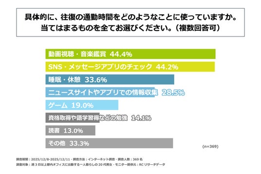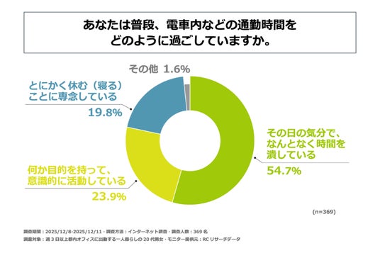 都内で働く一人暮らしの20代の男女の約55%が、電車内などの通勤時間を、その日の気分でなんとなく時間を潰して過ごしている。往復の通勤時間を使って行っていることは主に「動画視聴・音楽鑑賞」や「SNS・メッセージアプリのチェック」。