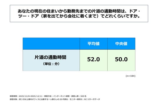 では、その「妥協」はどの程度のものなのでしょうか。通勤時間を妥協した人の現在の片道通勤時間は、平均52.0分、中央値50.0分となりました。都内勤務でありながら、家賃の安さや部屋の広さを求めて通勤時間を妥協する場合、片道50分程度が目安となっていることが明らかになりました。