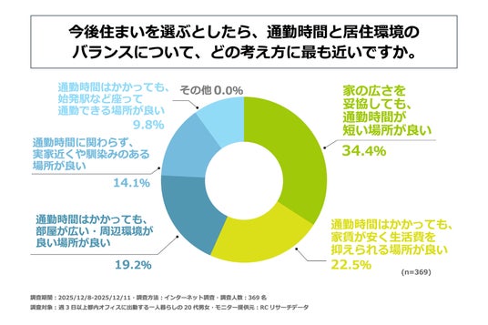 さらに今後の住まい選びに関しては、明確な意識の変化が見られました。「家の広さを妥協しても、通勤時間が短い場所が良い」と回答した人が34.4%だったのに対し、「通勤時間はかかっても、家賃が安い」「通勤時間はかかっても、部屋が広い・周辺環境が良い」といった居住環境を優先する回答の合計は65.6%に達しています。