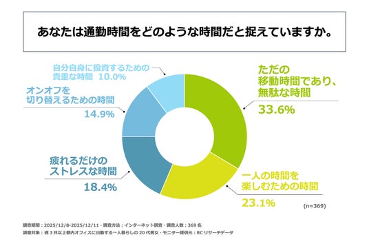都内で働く一人暮らしの20代の男女のうち、通勤時間を「ただの移動時間であり、無駄な時間」や「疲れるだけのストレスな時間」と捉えている人が半数以上いる一方で、「一人の時間を楽しむための時間」と捉えている人も2割以上いる