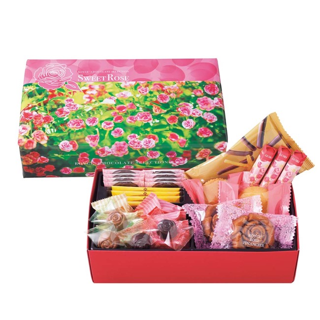 可憐に咲くバラの花の形をしたフィナンシェやチョコレートをはじめ、ピンクや白、黄色など花束を思わせる華やかなカラーの個包装のお菓子を、真っ赤な化粧箱に詰めました。"スイートローズ"をテーマにロイズ自慢のチョコレートやお菓子をセレクトしたひと箱です。包装紙にはロイズ本社ビル敷地内に広がる、バラと様々な花に彩られた「ロイズ ローズガーデン」のバラの写真を使用しています。