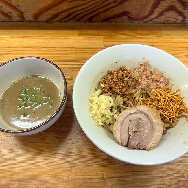 まぜそばの原点とも言える埼玉県春日部市「ジャンプ」と、その弟子が手掛ける栃木県小山市「ハイマウント」のコラボメニュー。そのままでも美味しい元祖まぜそばを、豚のゲンコツ、背ガラ等を10時間じっくり炊いた濃厚なつけ汁につけて食べると、圧倒的な美味しさに。麺は浅草開化楼の特注極太麺を使用しており、ジャンクな仕上がりになっています。